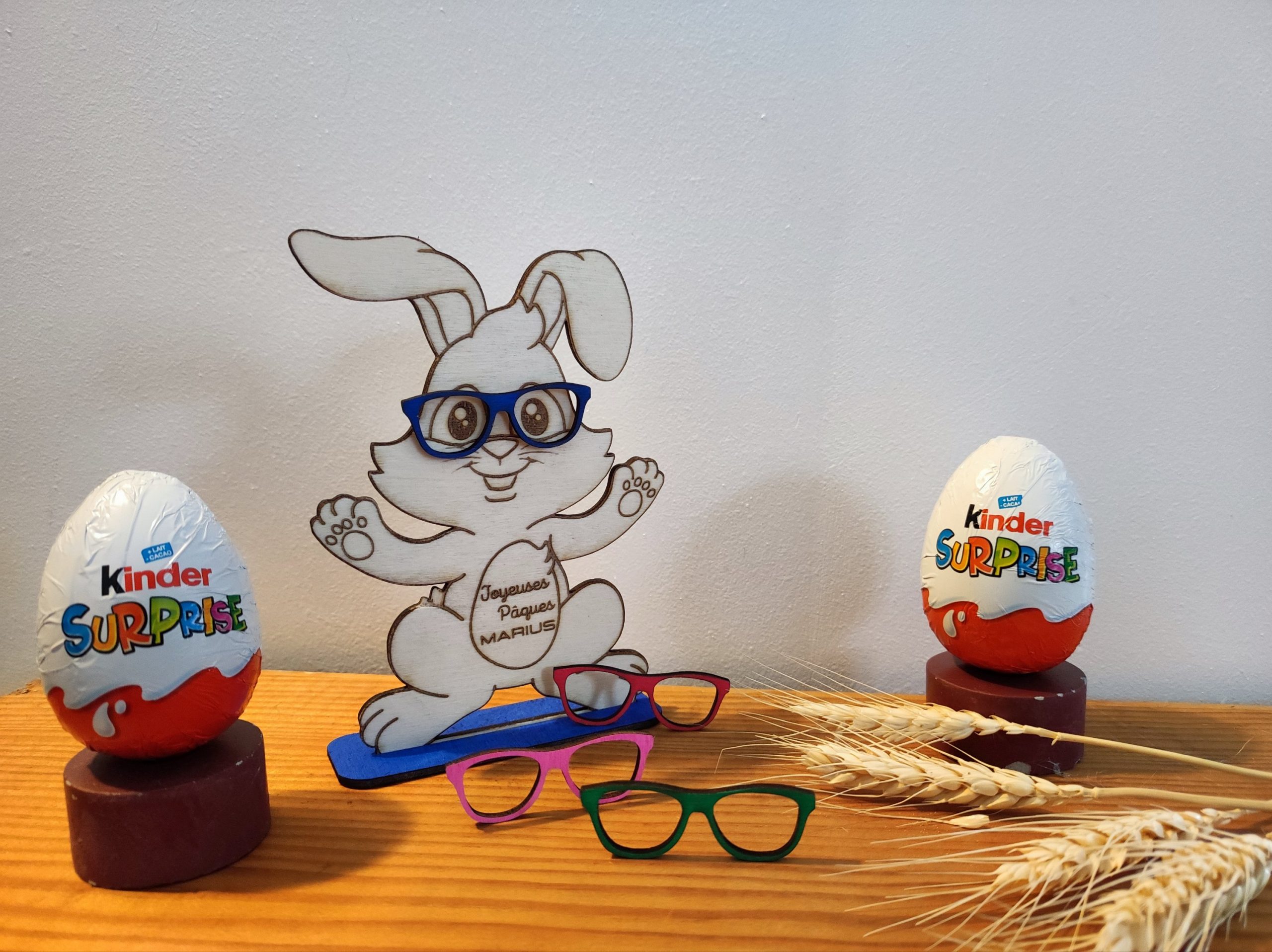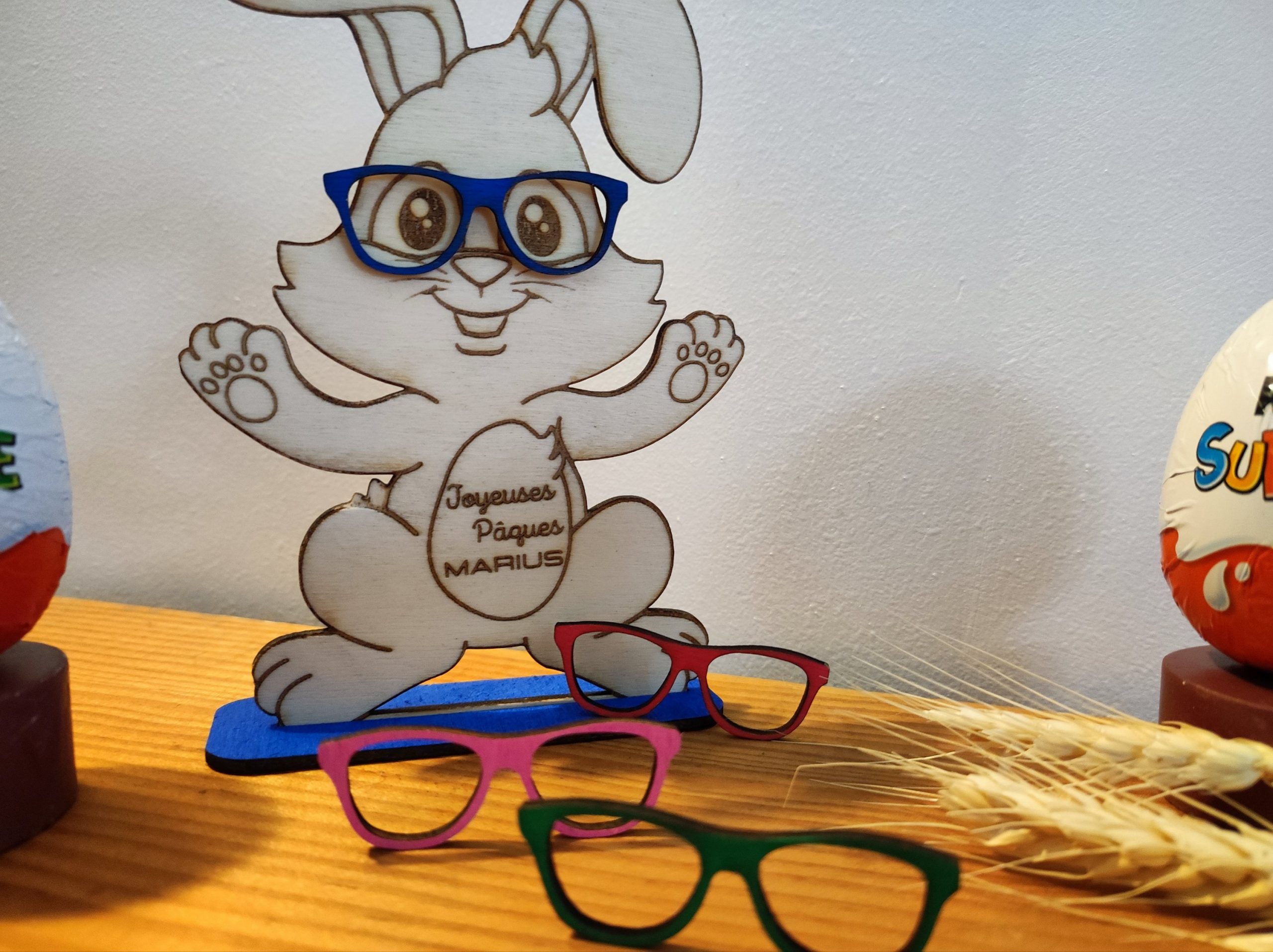 choix de la couleur des lunettes et du support : bleu, vert, rose ou rouge